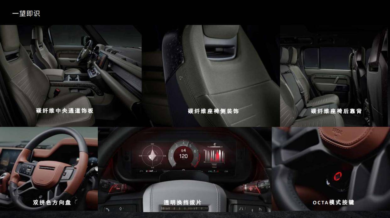 OCTA是卫士的极致形态,该模式搭载专为松散砾石路面而设计的独特刹车校准功能。它采用全新设计的保险杠和进气格栅,宽体的加入,使车身加宽68毫米,高了28毫米,车内外使用大量的碳纤维材质,这也是其显著区别于常规版本卫士的地方。OCTA BLACK车型采用极境黑专属外观并搭配扩展黑色外观套件。