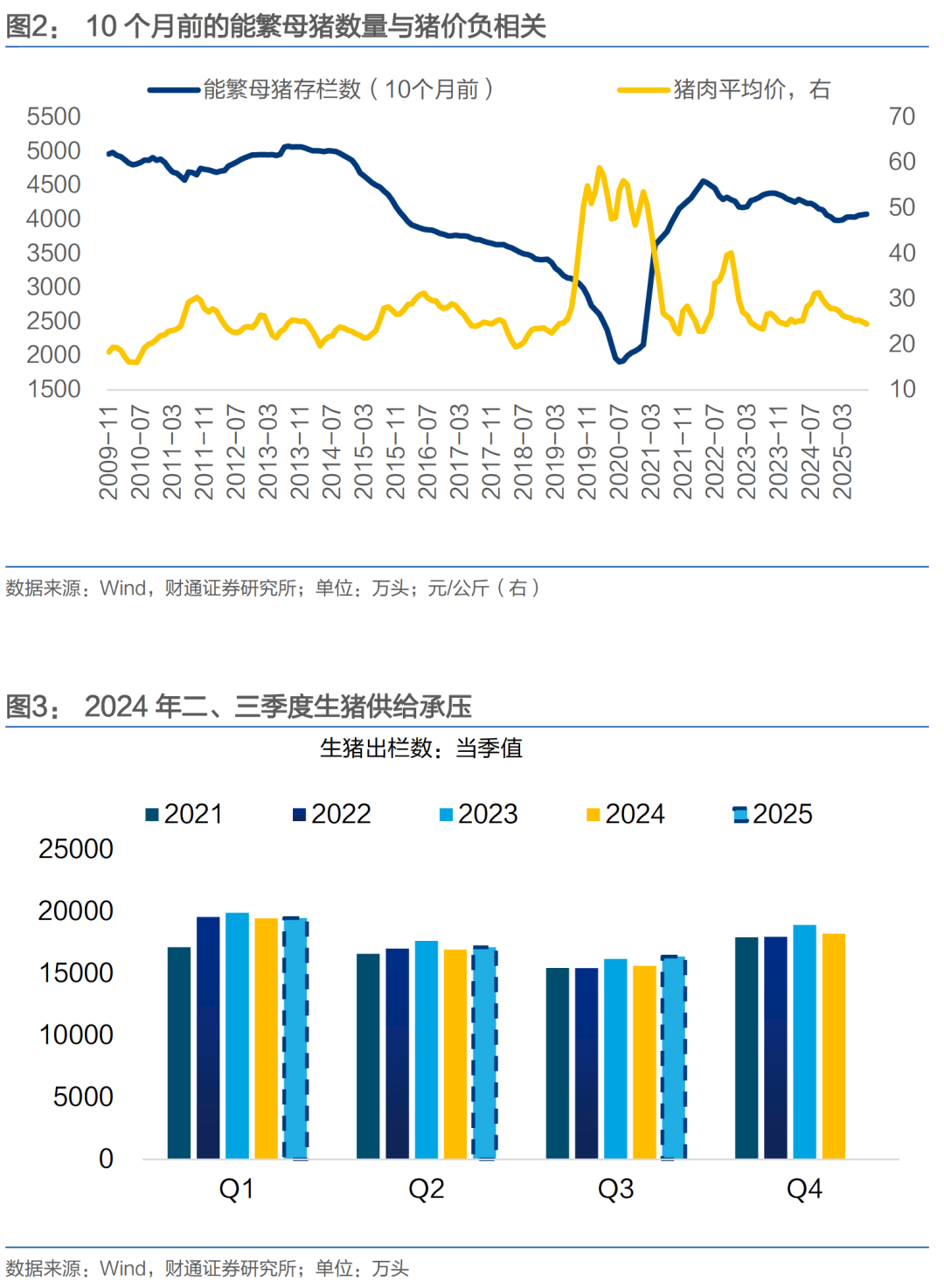 2024年5-8月猪价的短暂上涨主要受前期能繁母猪去化的支撑。前期能繁母猪的持续去化影响生猪出栏量,同时猪价上涨预期下养殖端压栏及二次育肥现象增多,带动猪价上行。基于生殖周期,能繁母猪数量领先生猪供给及猪价变动10个月左右(包括4个月妊娠+6个月育肥)。从历史数据来看,10个月前的能繁母猪数量与猪价存在明显的负相关关系。2023年因猪价持续下行,养殖端利润明显亏损,加速了产能去化,导致 2023 年下半年能繁育母猪存栏量加速收缩,影响了2024年二、三季度的生猪供给。