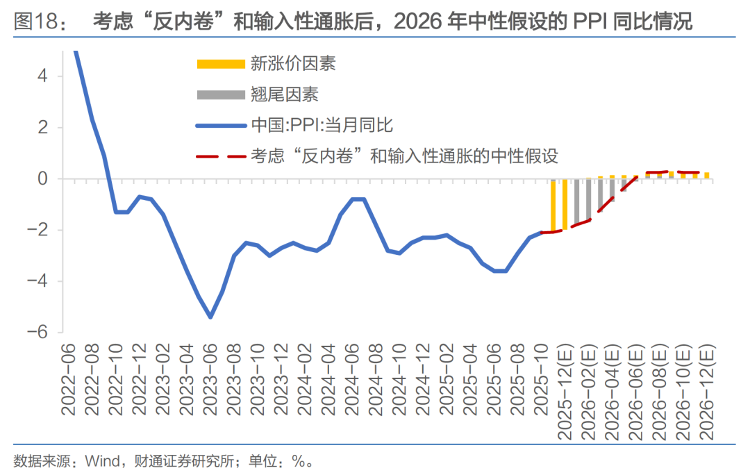 考虑输入性通胀以后,在中性预期下,预计到 2026 年 12 月,PPI 同比增速将回升到 0.2%,全年中枢约为-0.4%。节奏上前低后高,2026 年 6 月前后 PPI当月同比有望转正。