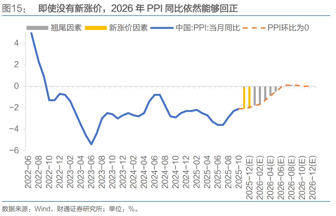 为了更好地观测翘尾因素对2026年PPI同比情况的影响,我们假设自2025年11月至2026年12月,PPI环比均为0%,即价格没有边际的变动。可以看到,在没有新涨价的影响下,2026年PPI同比仍然会在7月回升至0.1%。