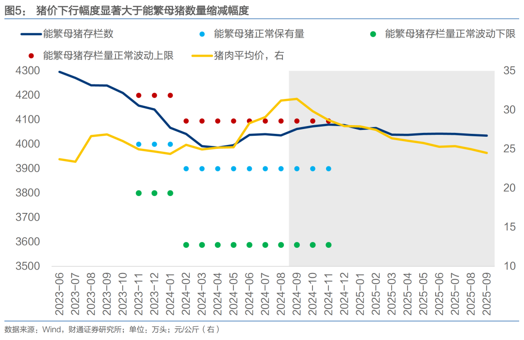 猪价持续走低,但产能去化节奏却偏缓慢。自去年四季度起,猪价便进入持续下行通道,但能繁母猪存栏量的收缩节奏却始终偏缓。2024 年 9 月至 2025 年 9月,猪肉均价下行22%,而能繁母猪存栏数仅下降1%左右,两者调整力度似乎并不匹配。