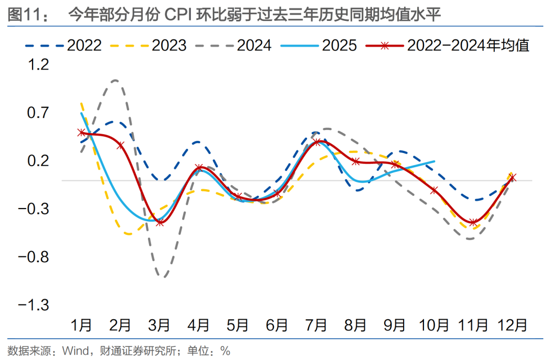 除了猪、油及核心 CPI 以外,基数对于明年 CPI 同比或存在拉动作用。今年前10个月 CPI 同比读数普遍不高,1-10 月当月同比的平均水平为 - 0.1%;部分月份(2 月、8 月及 9 月等) CPI 环比变动也弱于过去三年的季节性水平。预计低基数效应将在一定程度上推升明年CPI同比读数。