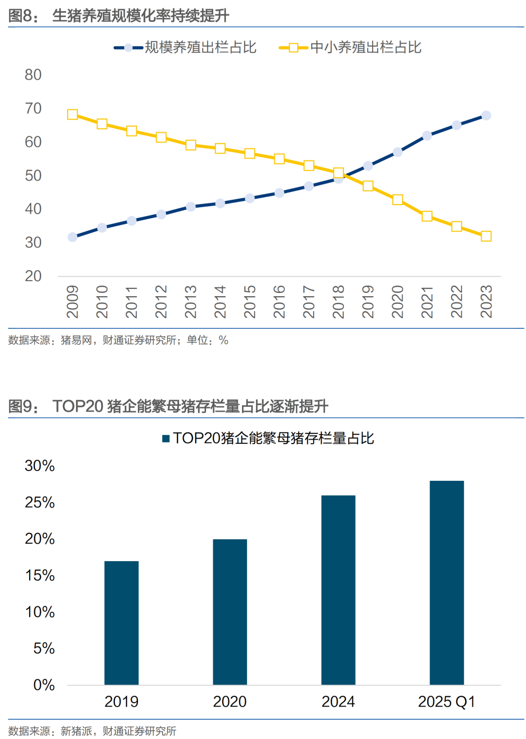 规模化养殖企业存在保份额诉求。对于规模化养殖的企业来说,其抗风险能力更强,成本优势更高,其决策更多聚焦于长期的市场份额而非短期利润,因此相比中小散户,规模养殖企业的产出更加“刚性”。即使在猪价下行时期,规模养殖户也可凭借资本和成本优势“逆势扩张,通过维持甚至增加出栏量,提升自身的市场占有率。据新猪派统计,2025 年 Q1,TOP20 企业能繁母猪存栏量较 2024年底增长6.21%,25家企业中有14家母猪规模同比增加。TOP20猪企能繁母猪总数占全国的比重也由 2024 年年底的 26%进一步提升至 28%。再加上生猪养殖规模化率持续提升,规模养殖企业对生猪供给的决定性作用愈发明显。农业农村部数据显示,生猪养殖规模化率已从2015年的不足40%提升至2024年的超70%。这也意味着,规模化企业会在很大程度上抵消中小散户产能的削减,进而延缓行业产能的去化节奏。