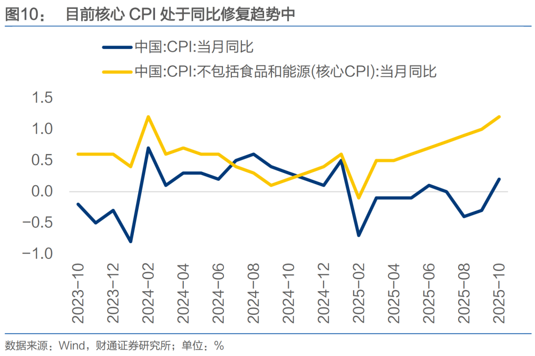 核心 CPI 反映的是物价趋势性的变动,与内需水平相关。目前核心 CPI 有所修复,基数、输入性影响及商品补贴政策是重要支撑。10月同比上涨1.2%,涨幅
