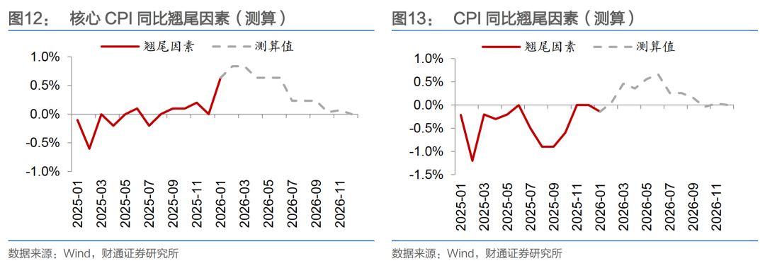 考虑季节性因素和猪、油两端的供给压力,我们预计核心 CPI、CPI 将在 11 月环比小幅回落,并于12月转为微升。结合已有环比数据,我们测算出2026年核心CPI、CPI同比的翘尾影响。从测算结果看,明年全年翘尾因素多数月份均是正向贡献,这在上半年体现得更为明显。
